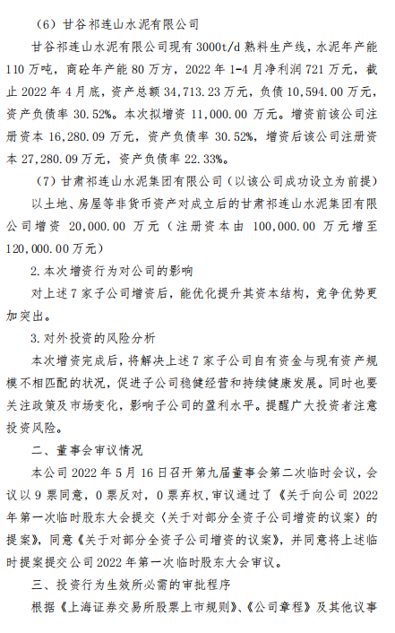 (5)漳縣祁連山水泥有限公司:漳縣祁連山水泥有限公司現有3000t/d+5000t/d兩條熟料生產線,水泥年產能320萬噸,2022年1-4月凈利潤2,420.52萬元,截止2022年4月底,資產總額75,296.94萬元,負債27,772.74萬元,資產負債率36.88%。本次擬增資24,000.00萬元。增資前該公司注冊資本32,400.00萬元,資產負債率36.88%,增資后該公司注冊資本56,400.00萬元,資產負債率27.97%。