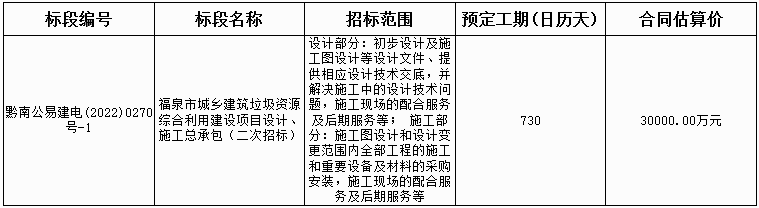 獲悉,福泉市城鄉(xiāng)建筑垃圾資源綜合利用建設(shè)項目設(shè)計、施工總承包啟動二次招標,項目總投資3億人民幣,預(yù)定工期730天,詳情如下: