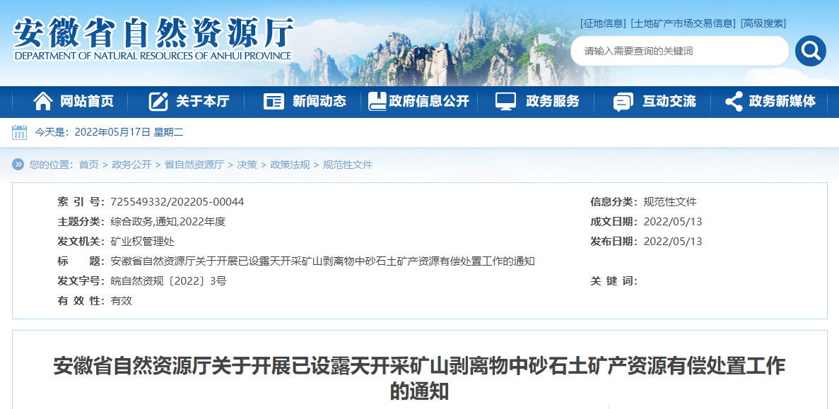 安徽省自然資源廳關(guān)于開展已設(shè)露天開采礦山剝離物中砂石土礦產(chǎn)資源有償處置工作的通知皖自然資規(guī)〔2022〕3號