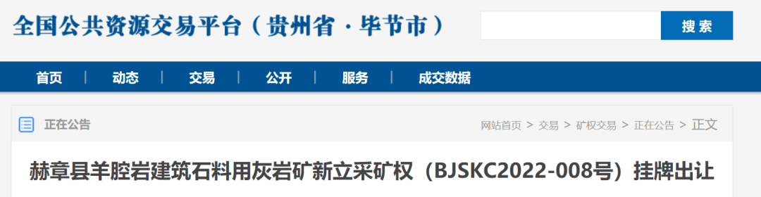 赫章縣羊腔巖建筑石料用灰巖礦新立采礦權掛牌出讓公告