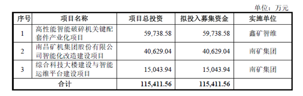 破碎機(jī)關(guān)鍵配套件產(chǎn)業(yè)化項(xiàng)目,總投資59738.58 萬元;南昌礦機(jī)集團(tuán)股份有限公司智能化改造建設(shè)項(xiàng)目,總投資40629.04 萬元;綜合科技大樓建設(shè)與智能運(yùn)維平臺(tái)建設(shè)項(xiàng)目,總投資15043.94萬元,合計(jì)總投資約11.54億元。