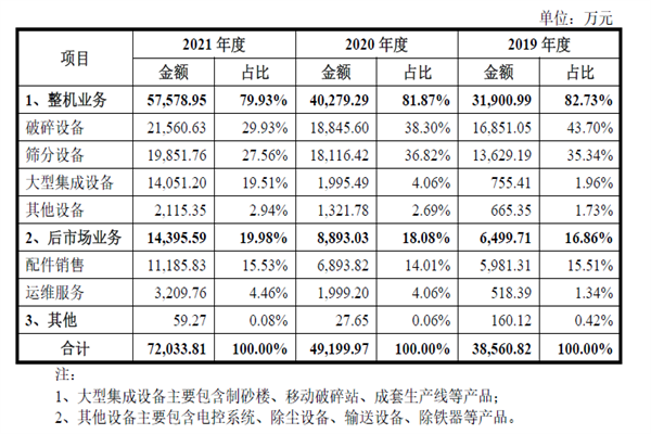 南昌礦機(jī)主要業(yè)務(wù)類型為整機(jī)業(yè)務(wù)、配件銷售、運(yùn)維服務(wù)等三種業(yè)務(wù)模式。整機(jī)業(yè)務(wù)方面,2019年、2020年、2021年的營(yíng)收分別達(dá)到31900.99萬元、40279.29萬元、57578.95萬元,其中2021年較2020年整機(jī)業(yè)務(wù)增幅高達(dá)43%,大型集成設(shè)備銷售收入的劇增是主要原因。2020年大型集成設(shè)備銷售收入為1995.49萬元,僅占公司營(yíng)收的4.06%,2021年就達(dá)到14051.20萬元,占到公司營(yíng)收的19.51%。此外,