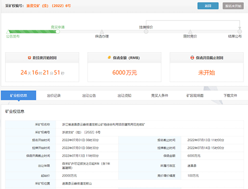 6月2日,浙江省礦業權網上交易系統發布浙江省遂昌縣云峰街道龍板山礦地綜合利用項目建筑用花崗巖礦出讓公告,設計生產規模1200萬噸/年,掛牌出讓起始價為2億元。