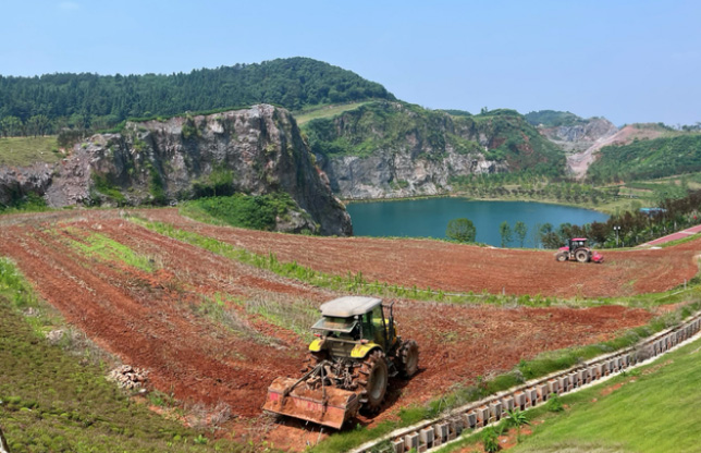記者在現場看見,如今,一期主打的“礦花樂園”已經完工,原本滿目瘡痍、灰禿禿的山體已是草木蔥綠,復墾的600多畝耕地、林地已見效益,裸露礦坑變身的翡翠湖已成為景區標志。如今,一期區域內正在種植新一批花種,開花后,園區內的色彩將更豐富。
