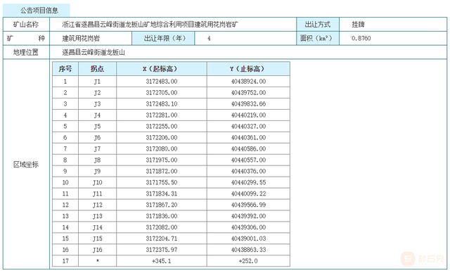 6月2日,遂昌縣自然資源和規劃局發布公告,掛牌出讓一宗建筑用花崗巖礦,擬出讓4年(含1年基建期),起始價2億元。