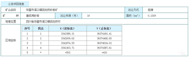 項目名稱為華鎣市溪口鎮回龍橋砂巖礦,礦區位于四川省華鎣市溪口鎮回龍橋村,礦區面積0.1319平方千米,資源儲量1005萬噸。