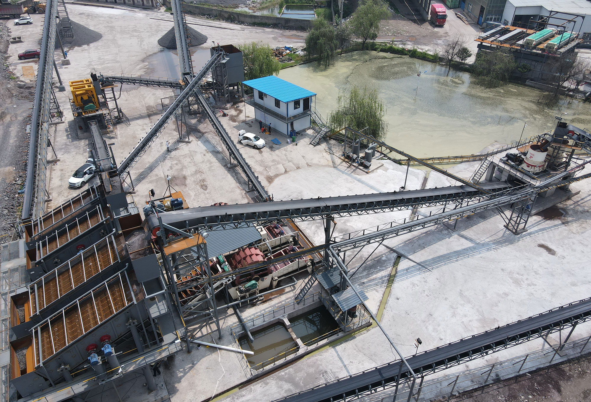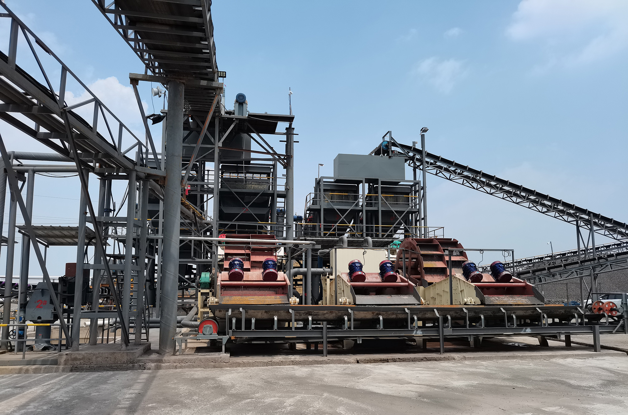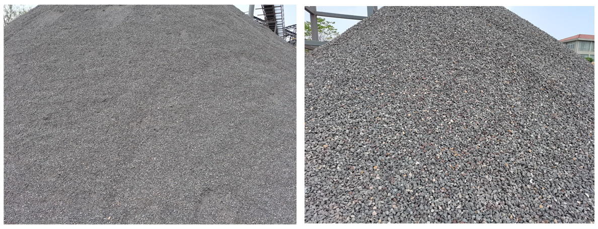 本項目恒基采用雙頭破設計,滿足用戶應對含泥量不同的原料,一臺鄂破配備洗石機,處理含泥量重的原料,減輕圓錐破碎機負載,并配備雙料倉,使主破碎設備達到產能最大化,損耗降低的效果。洗沙部分采用螺旋洗沙機和葉輪洗沙機搭配,先入螺旋洗沙機使泥砂分離,后入葉輪洗沙機,減低細沙流失率,降低細砂回收一體機的負載,洗出的成品砂含泥量低,粒型好看。
