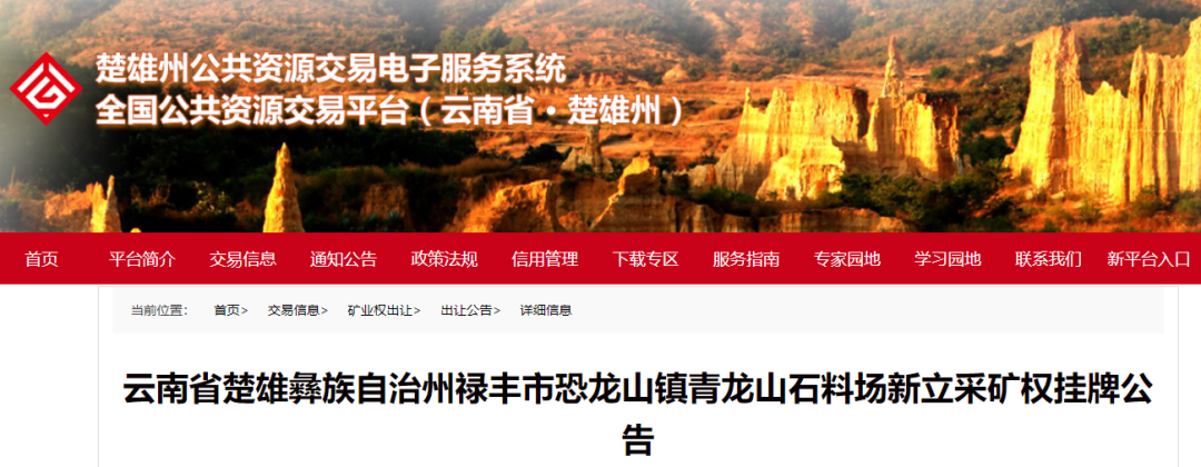 云南省楚雄彝族自治州祿豐市恐龍山鎮青龍山石料場新立采礦權掛牌公告根據《中華人民共和國礦產資源法》、《探礦權采礦權招標拍賣掛牌管理辦法(試行)》(國土資發〔2003〕197號)和《礦業權交易規則》(國土資規〔2017〕7號)、《云南省自然資源廳關于貫徹落實自然資源部推進礦產資源管理改革若干事項的實施意見(試行)》(云自然資規〔2020〕2號)的規定,經楚雄州人民政府批準,現以掛牌方式公開出讓祿豐市恐龍山鎮青龍山石料場采礦權,現將有關事項公告如下: