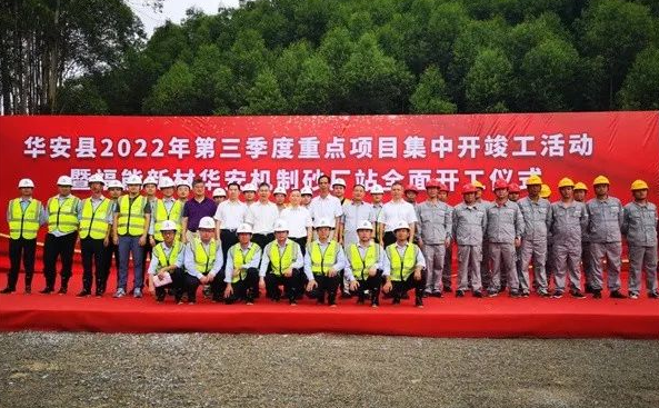 7月4日上午,福能新材公司參與福建省漳州市華安縣2022年第三季度重點項目集中開竣工活動暨福能新材華安機制砂項目廠站全面開工儀式,此舉意味著該項目吹響沖刺“集結號”,全面開啟“加速跑”模式。