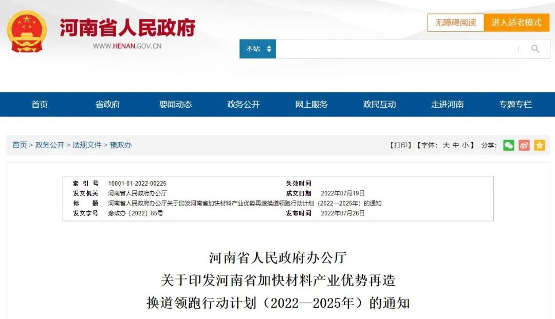 7月27日,根據(jù)河南省人民政府辦公廳關(guān)于印發(fā)的《河南省加快材料產(chǎn)業(yè)優(yōu)勢再造換道領(lǐng)跑行動(dòng)計(jì)劃(2022—2025年)》(以下簡稱“計(jì)劃”)要求,到2025年,基本實(shí)現(xiàn)全省材料產(chǎn)業(yè)優(yōu)勢再造、換道領(lǐng)跑和綠色低碳轉(zhuǎn)型,成為全國重要的材料創(chuàng)新高地和先進(jìn)材料基地。
