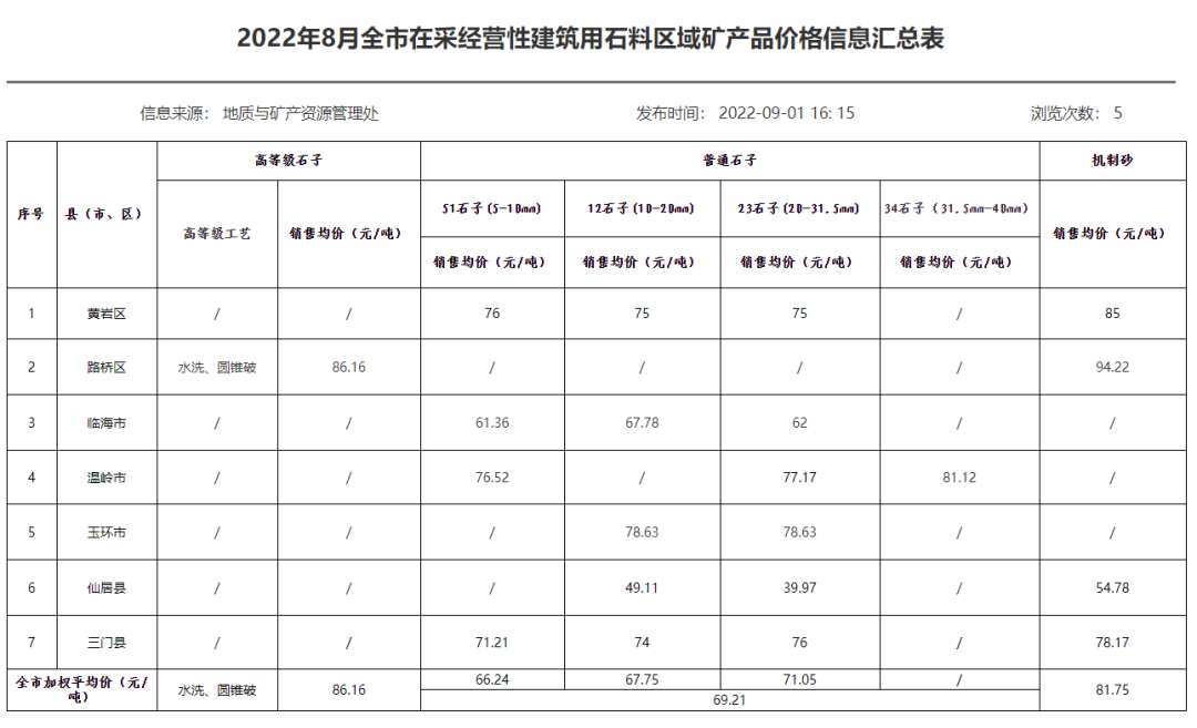 獲悉,浙江省臺州市發(fā)布了8月建筑用石料區(qū)域礦產(chǎn)品價(jià)格信息,高品質(zhì)碎石、普通碎石以及機(jī)制砂平均價(jià)格分別為86.16元/噸,69.21元/噸、81.75元/噸。