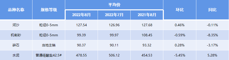 河沙、機(jī)制砂、碎石價(jià)格較為平穩(wěn)。8月份全省河沙(粒徑0-5mm)、機(jī)制砂(粒徑0-5mm)、碎石(當(dāng)?shù)刂麂N)每噸均價(jià)分別為127.54元、99.39元、90.37元,環(huán)比分別微漲0.46%、微跌0.59%、微漲0.28%,同比分別微跌0.11%、下跌8.35%、3.17%。