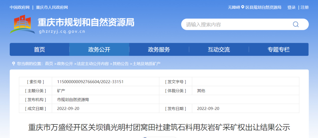 1、萬盛經(jīng)開區(qū)關(guān)壩鎮(zhèn)光明村團(tuán)窩田社建筑石料用灰?guī)r礦:成交價:2.58億元;競得人名稱:陜西生態(tài)水泥股份有限公司;資源儲量:5169萬噸,生產(chǎn)規(guī)模300萬噸/年。