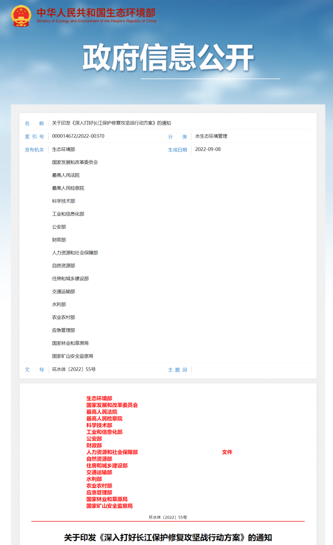 近日,生態(tài)環(huán)境部、國(guó)家發(fā)展和改革委員會(huì)、最高人民法院、最高人民檢察院、科學(xué)技術(shù)部、工業(yè)和信息化部、公安部、財(cái)政部、人力資源和社會(huì)保障部、自然資源部、住房和城鄉(xiāng)建設(shè)部、交通運(yùn)輸部、水利部、農(nóng)業(yè)農(nóng)村部、應(yīng)急管理部、國(guó)家林業(yè)和草原局、國(guó)家礦山安全監(jiān)察局等17個(gè)部門和單位聯(lián)合印發(fā)《深入打好長(zhǎng)江保護(hù)修復(fù)攻堅(jiān)戰(zhàn)行動(dòng)方案》(以下簡(jiǎn)稱《行動(dòng)方案》)。