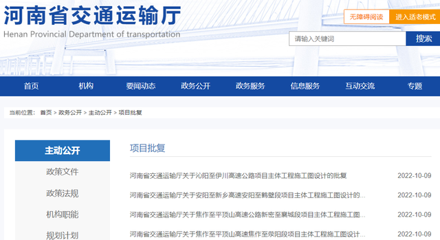 10月9日,河南省交通運輸廳批復(fù)了焦作至平頂山高速焦作至滎陽段項目、焦作至平頂山高速公路新密至襄城段項目、安陽至新鄉(xiāng)高速安陽至鶴壁段項目、沁陽至伊川高速公路項目4條高速公路主體工程施工圖設(shè)計,總投資約445.59億元。