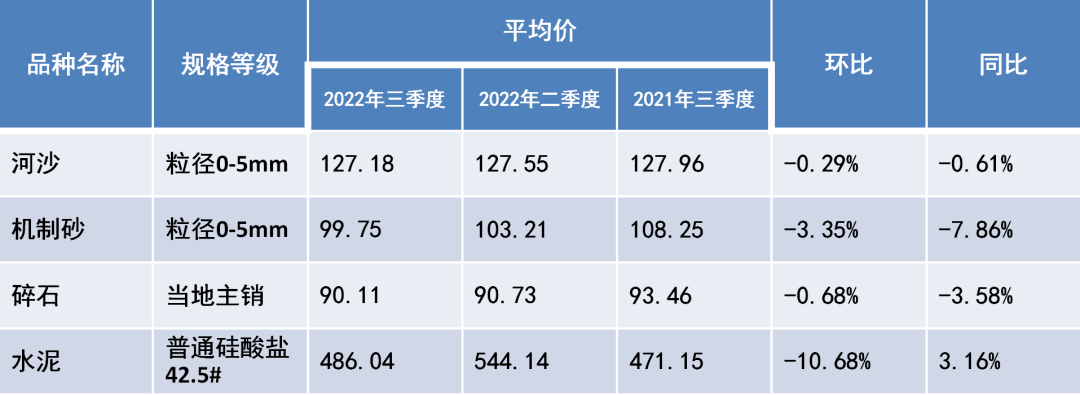 三季度江西全省河沙(粒徑0-5mm)、機(jī)制砂(粒徑0-5mm)、碎石(當(dāng)?shù)刂麂N)每噸均價(jià)分別為127.18元、99.75元、90.11元,環(huán)比分別微跌0.29%、3.35%、0.68%,同比分別下跌0.61%、7.86%、3.58%,其中9月份每噸均價(jià)分別為127.05元、99.88元、89.87元,環(huán)比分別微跌0.39%、微漲0.50%、微跌0.55%,同比分別下跌1.08%、7.27%、3.84%。