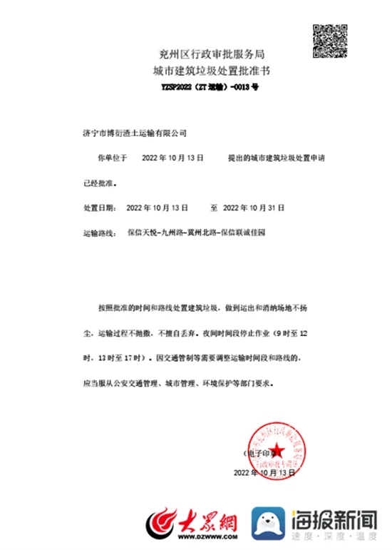濟寧兗州區(qū)核發(fā)首張城市建筑垃圾處置批準書電子證照