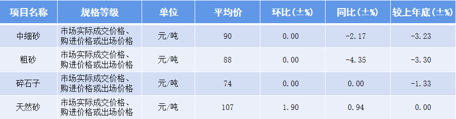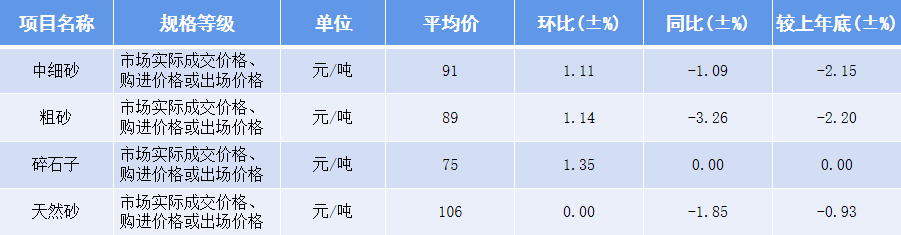 近日,據四川省發改委發布的能源和工業生產資料價格監測表顯示:2022年9月,四川省中細砂平均價91元/噸,環比上漲1.11%,同比下降1.09%;粗砂平均價89元/噸,環比上漲1.14%,同比下降3.26%;碎石子平均價75元/噸,環比上漲1.35%,同比持平;天然砂平均價106元/噸,環比持平,同比下降1.85%。