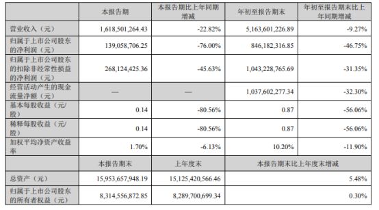 今年前三季度,上峰水泥主業(yè)經營總體保持穩(wěn)定,1~9月份上峰水泥實現營業(yè)收入51.63億元,較上年同期下降9.27%,經營業(yè)務綜合毛利率37.10%,銷售凈利率16.93%;受持有證券的公允價值下行影響,合并凈利潤同比下降,前三季度公司實現凈利潤8.74億元,同比下降46.48%,歸屬于上市公司股東的凈利潤8.46億元,同比下降46.75%,歸屬于上市公司股東的扣除非經常性損益的凈利潤10.43億元,同比下降31.35%。