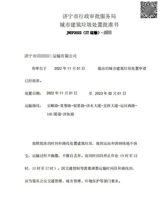 濟寧市行政審批服務(wù)局城市建筑垃圾處置批準(zhǔn)書