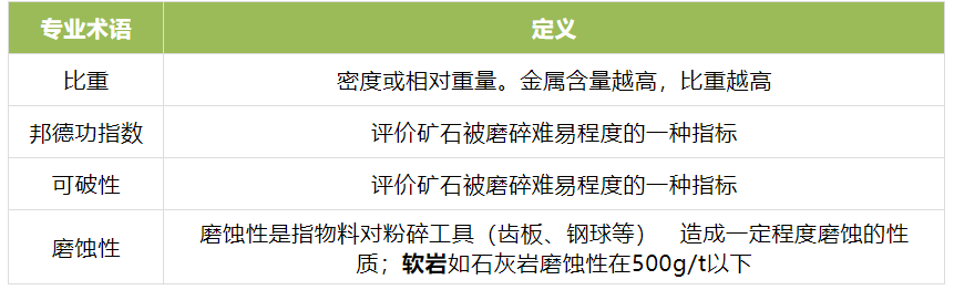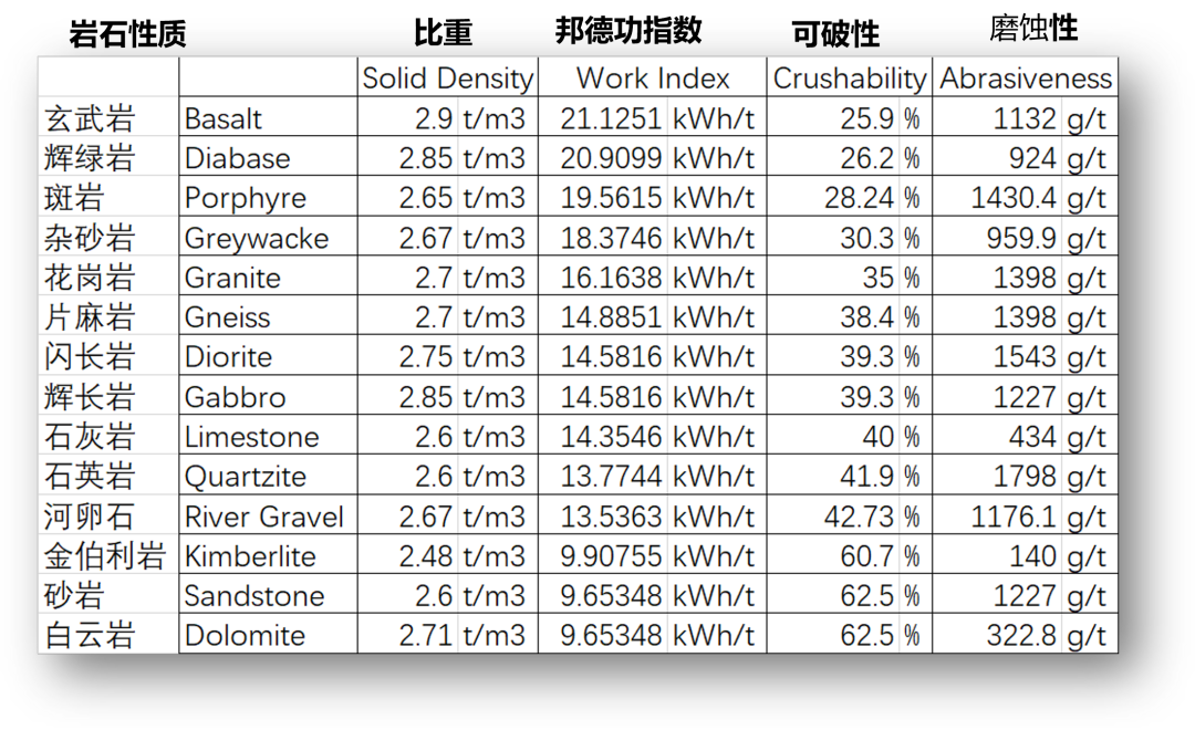 來(lái)料性質(zhì)中有幾個(gè)關(guān)鍵點(diǎn)值得注意:巖石類(lèi)型包括比重、可破性、磨蝕性,入料最大粒度、含水量和含泥量。