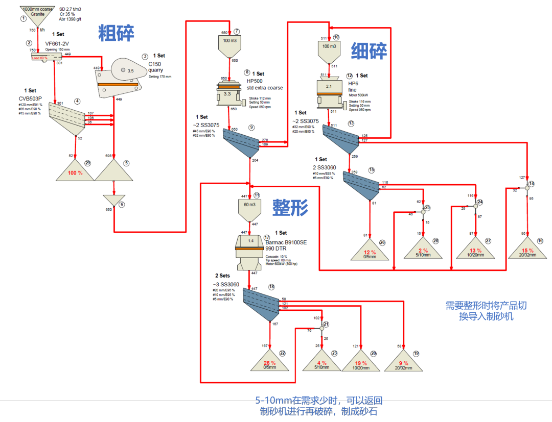 砂石骨料生產(chǎn)線(日產(chǎn)8000噸以上)一般采用三段一閉的破碎工藝,入料最大粒度在800mm-1000mm,產(chǎn)品一般包含4類(lèi):粉料、瓜米石、12#碎石和13#碎石。