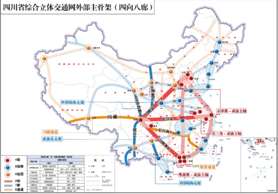 同時(shí),推動(dòng)交通樞紐和鐵路集疏運(yùn)網(wǎng)絡(luò)同步規(guī)劃、設(shè)計(jì)、建設(shè)和運(yùn)營,構(gòu)建以成都、重慶、貴陽為主樞紐,宜賓、遂寧、廣元等為次級(jí)樞紐的“3+11”現(xiàn)代化綜合交通樞紐集群,并按照站城一體化思路,積極推行TOD發(fā)展模式,建成投用成都天府站、重慶東站等大體量客站,做到高鐵、地鐵、公交等便捷換乘。在四川,對(duì)外,將進(jìn)一步打通出川大通道,加快推進(jìn)成渝中線高鐵、成達(dá)萬高鐵、西渝、渝昆高鐵等時(shí)速350公里項(xiàng)目建設(shè),新增2000余公里鐵路里程,提高東、南、北三向出川通道能級(jí),形成成都至北京、上海全程時(shí)速350公里高鐵大通道,助力四川跨入全國高鐵“第一梯隊(duì)”。對(duì)內(nèi),將加快推進(jìn)城市群交通一體化建設(shè), 爭(zhēng)取在未來五年建成漢巴南鐵路、成都至自貢至宜賓高鐵,有序推進(jìn)成德眉市域鐵路建設(shè),做好綿遂內(nèi)城際鐵路、南充至廣安鐵路前期工作,爭(zhēng)取瀘州至遵義高鐵納入國家規(guī)劃,構(gòu)建完善四川省域現(xiàn)代化鐵路網(wǎng),推進(jìn)四川鐵路運(yùn)輸布局和能力進(jìn)一步優(yōu)化升級(jí)。