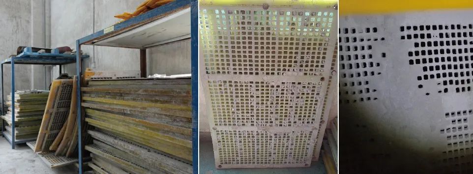 已被替換的傳統(tǒng)國產(chǎn)聚氨酯篩網(wǎng),下層篩面堵礦、粘料現(xiàn)象嚴(yán)重