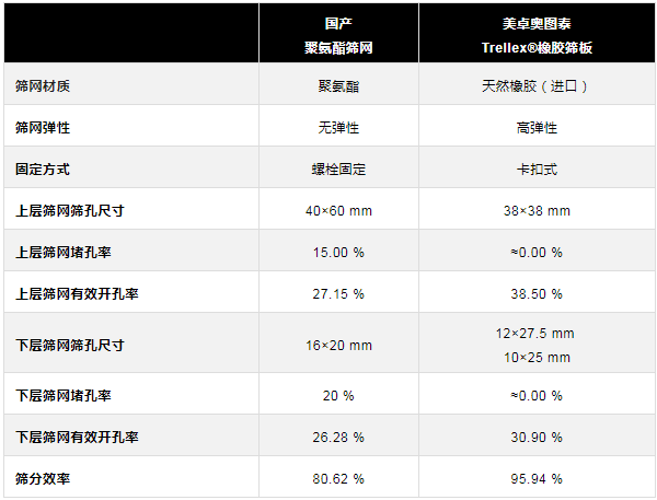 2022年10月7日,經(jīng)過近三個(gè)月的生產(chǎn)應(yīng)用,現(xiàn)場針對配備Trellex橡膠篩板的3675-2振動篩進(jìn)行實(shí)測,數(shù)據(jù)表明:篩分效率由原來的80.62%提升至95.94%,效率提升15.32%。破碎系統(tǒng)處理量由原來的218噸/時(shí)提升至261噸/時(shí),處理能力提高19.75%。在產(chǎn)能目標(biāo)不變的情況下,破碎系統(tǒng)的開車時(shí)間可縮短2.17時(shí)/日,系統(tǒng)電單耗下降16.49%。