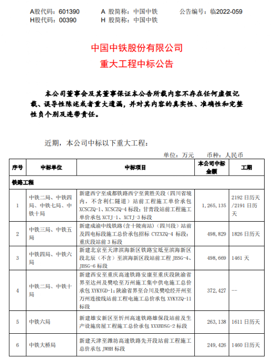 中國(guó)中鐵中標(biāo)價(jià)合計(jì)約人民幣589億元,約占公司2021年?duì)I業(yè)收入的5.51%。