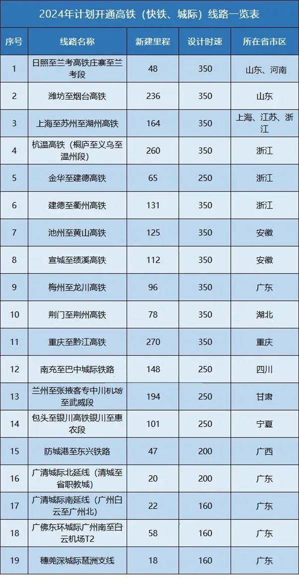 2、到2024年,安徽浙江多條高鐵將開通,長三角地區(qū)高鐵進一步加密;隨著重慶至黔江高鐵通車,渝廈高鐵通道重慶至長沙段將全線貫通;日蘭(魯南)高鐵剩余最后一段也將打通;山東半島環(huán)線高鐵全面建成。