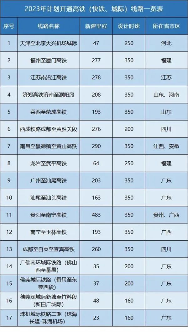 1、在2023年,貴南高鐵通車,貴州和廣西省會間將實現(xiàn)高鐵直通;濟鄭高鐵全線貫通后,山東、河南兩省省會高鐵將直連;黃昌高鐵開通后安徽與江西間將又多一條高鐵新通道;多個省省會至省內(nèi)地市的干線高速鐵路項目將通車;珠三角多條城際鐵路也將開通。