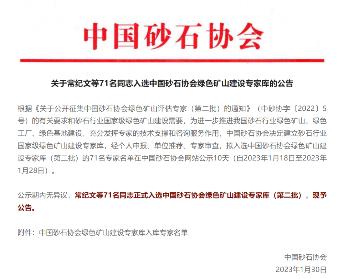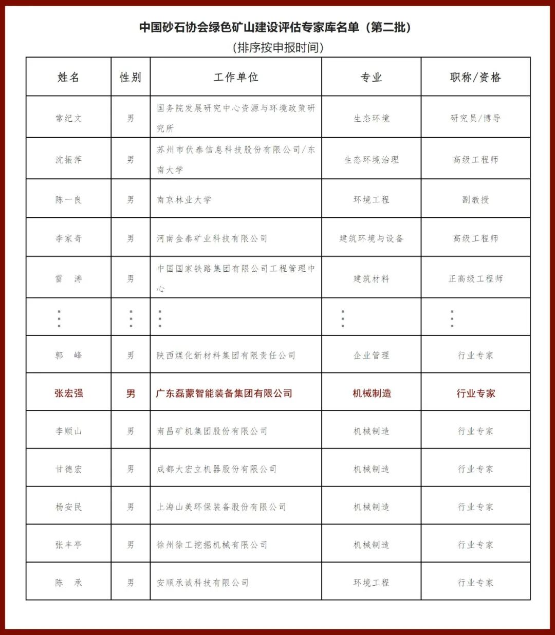 近期,中國(guó)砂石協(xié)會(huì)發(fā)布了“關(guān)于常紀(jì)文等71名同志入選中國(guó)砂石協(xié)會(huì)綠色礦山建設(shè)專(zhuān)家?guī)斓墓?rdquo;,廣東磊蒙智能裝備集團(tuán)董事長(zhǎng)張宏強(qiáng)作為機(jī)械制造行業(yè)專(zhuān)家成功入選!