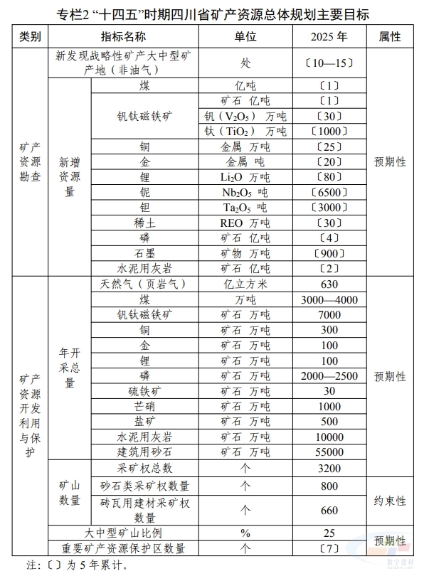“十四五”時期,新發(fā)現(xiàn)戰(zhàn)略性礦產(chǎn)資源大中型礦產(chǎn)地10—15處,新增煤炭資源量1億噸、釩鈦磁鐵礦1億噸、銅(金屬)25萬噸、金(金屬)20噸、鋰(Li2O)80萬噸、稀土(REO)30萬噸、磷礦石4億噸、石墨(礦物)900萬噸、水泥用灰?guī)r2億噸。