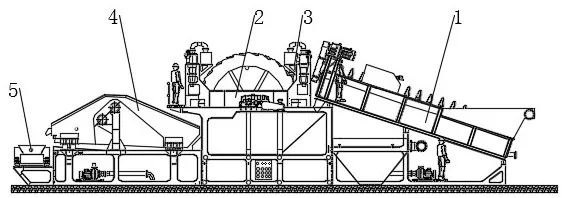 據(jù)了解,一種數(shù)字化洗砂回收工作站,包括依次串聯(lián)布置的螺旋洗砂機(jī)、輪式洗砂機(jī)、高頻震動脫水篩和皮帶秤,所述螺旋洗砂機(jī)傾斜放置,且螺旋洗砂機(jī)的末端出料口處于輪式洗砂機(jī)的入料口上方,所述輪式洗砂機(jī)的出料口處于高頻震動脫水篩入料口的上方,所述螺旋洗砂機(jī)和高頻震動脫水篩的下置水箱均通過渣漿泵連通設(shè)置有旋流器組,所述旋流器組的出砂口處于輪式洗砂機(jī)的水箱上方,本數(shù)字化洗砂回收工作站通過對螺桿進(jìn)行設(shè)計,模擬人工揉搓的方式,增加砂石表層雜質(zhì)去除率,且便于將砂石內(nèi)大顆粒進(jìn)行篩分,節(jié)約后續(xù)工序,而且實(shí)現(xiàn)數(shù)字化顯示,便于記錄和調(diào)整操作。