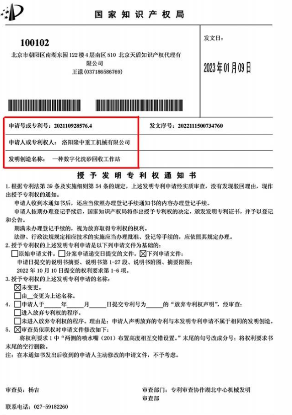 近日,洛陽隆中重工機(jī)械有限公司收到國家知識產(chǎn)權(quán)局下發(fā)“授予發(fā)明專利權(quán)通知書,授予隆中重工“一種數(shù)字化洗砂回收工作站”發(fā)明專利。