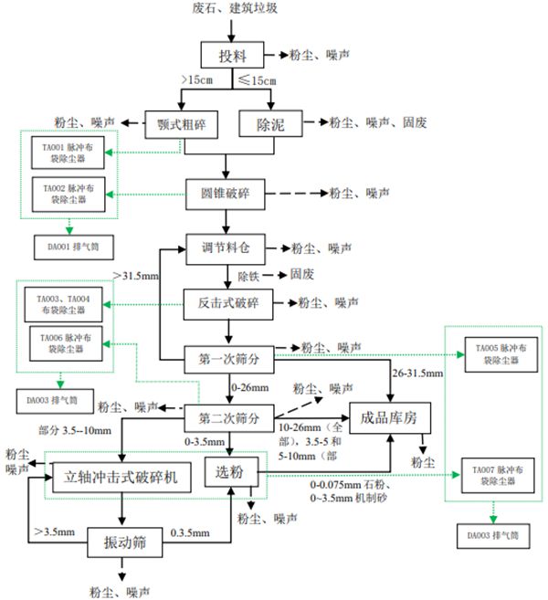 廢石、建筑垃圾加工工藝流程及產(chǎn)污環(huán)節(jié)圖