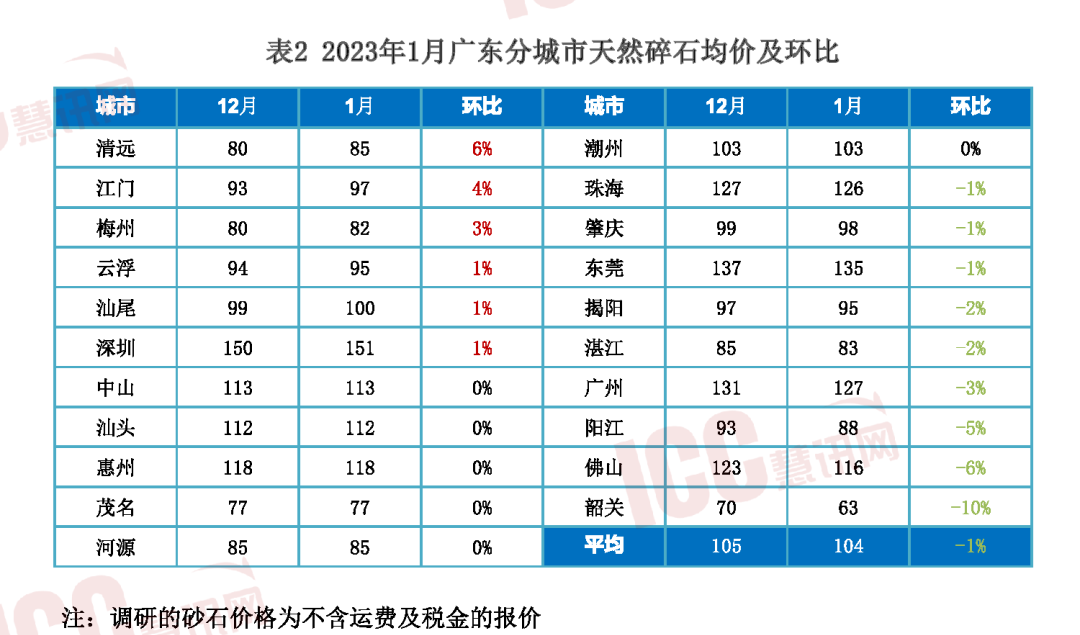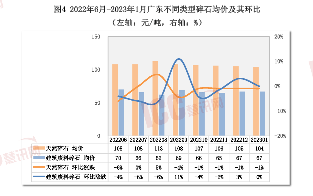 1月份成功調(diào)研廣東碎石83個(gè)樣本。其中天然碎石為104元/t,環(huán)比12月下跌1%;建筑廢料碎石為67元/t,和上月保持一致。
