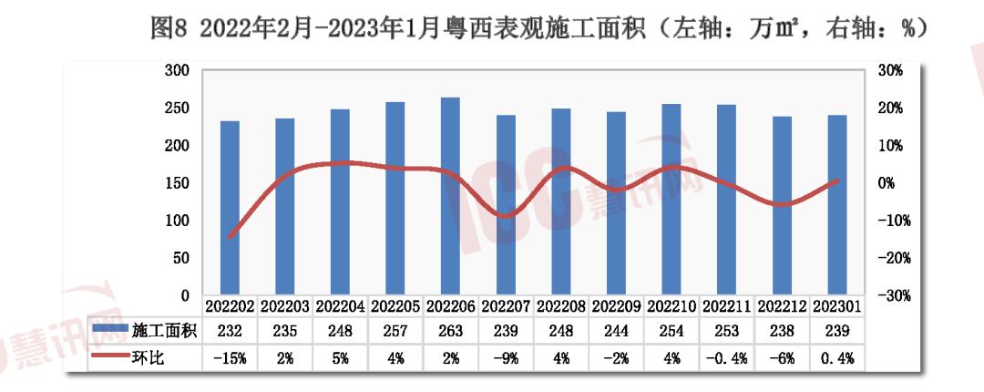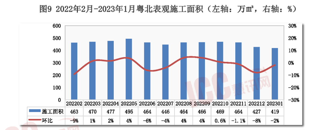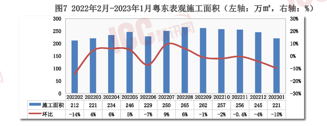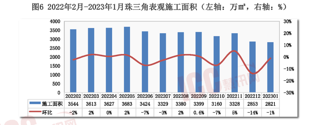 進(jìn)入2023年,受春節(jié)假期影響,部分項(xiàng)目春節(jié)前搶工,大部分項(xiàng)目施工暫停或放緩,至月底才緩慢開工,施工速度有待恢復(fù)。表觀施工面積上除粵西略有增長(zhǎng)外,珠三角,粵東和粵北區(qū)域表觀施工面積均有所回落。其中粵東施工面積降幅最大,環(huán)比下跌10%,珠三角和粵北分別下跌1%和2%。