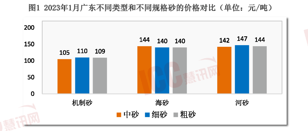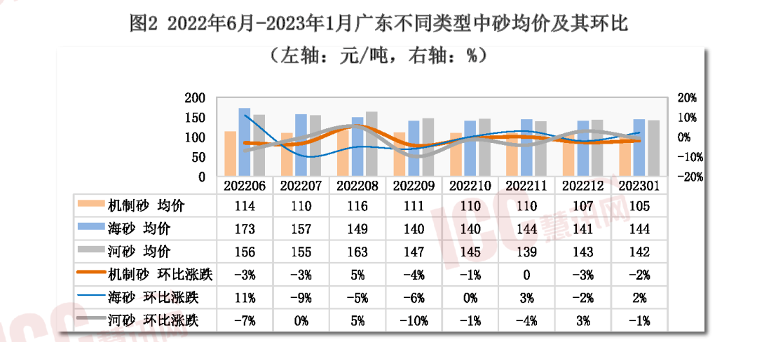 1月份調(diào)研砂樣本量225個(gè)。以中砂為例,機(jī)制砂105元/t,較12月下降2%;海砂144元/t,環(huán)比增長(zhǎng)2%;河砂142元/t,環(huán)比下滑1%。