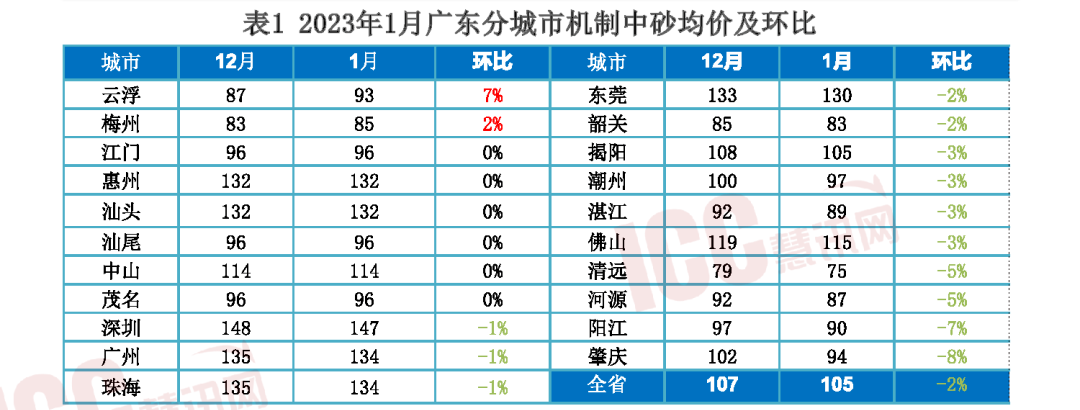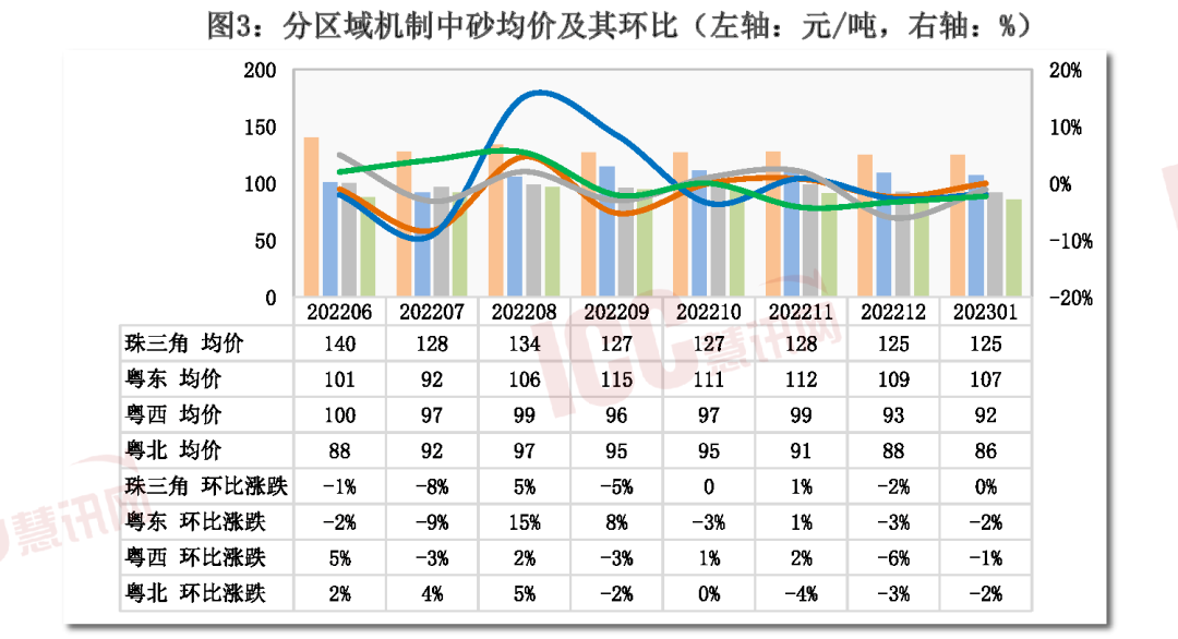 以機(jī)制中砂為例,全省平均價(jià)格較上月環(huán)比下滑2%。從區(qū)域看,本月四個(gè)區(qū)域除珠三角區(qū)域和上月持平外,其他區(qū)域均小幅下跌,其中粵東和粵北下跌幅度一致為2%,粵西下跌1%。從各城市情況看,超一半城市機(jī)制砂價(jià)格下跌,部分城市和上月持平。肇慶下跌幅度最大為8%,云浮增長(zhǎng)最多,環(huán)比增長(zhǎng)7%。