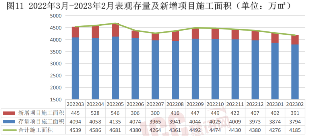 2023年2月表觀存量項(xiàng)目施工面積約3794萬㎡,近半年月均新增項(xiàng)目施工面積約391萬㎡,預(yù)計(jì)2023年2月總施工面積約4185萬㎡,整體低于2023年1月。
