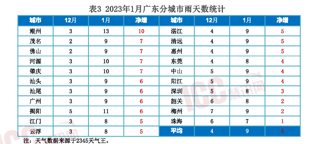 1月各城市雨水天氣均有所增加,一半城市雨水天比上月增加超過5天。其中潮州雨水天比上月增加10天。雨水天氣主要集中在年前一周,很多項(xiàng)目已停工或減緩施工,整體對(duì)開工率相對(duì)影響不大。