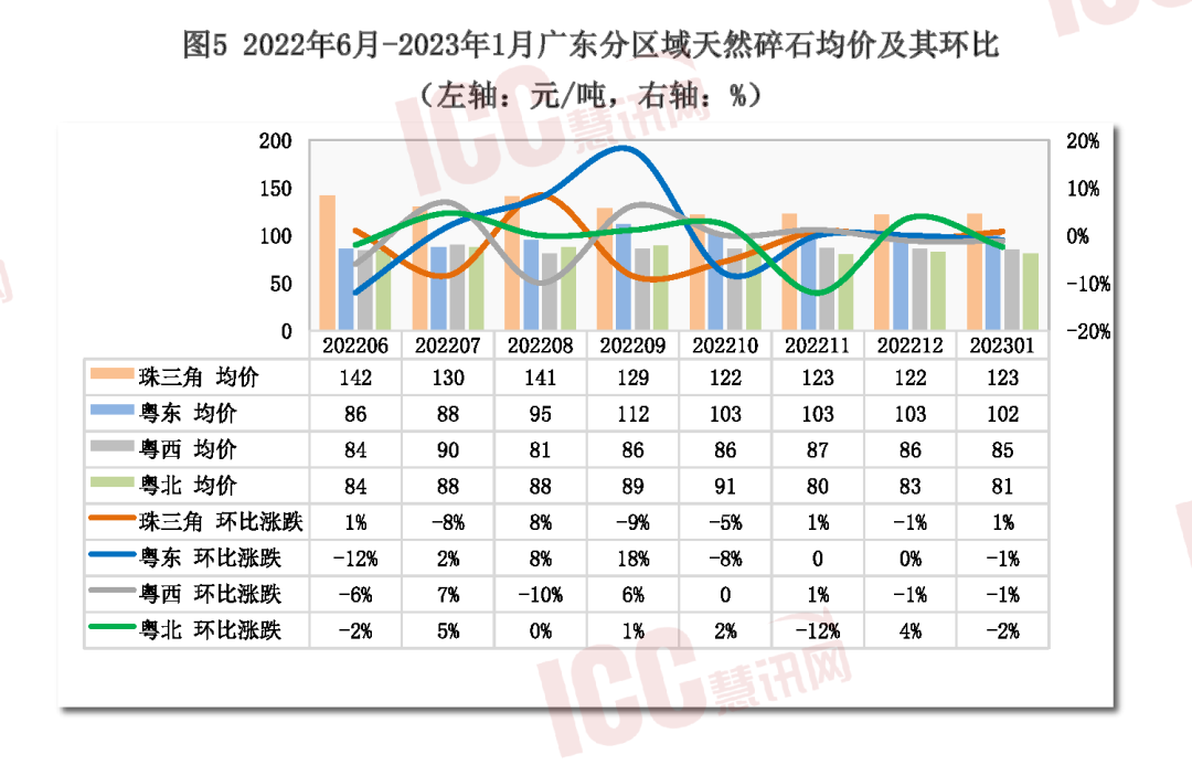 以天然碎石為例,全省平均價(jià)格較上月小幅回落1%。從區(qū)域看,珠三角微幅上漲1%,粵東和粵西均同比下滑1%,粵北下滑2%。從城市面看,全省天然碎石價(jià)格漲跌互現(xiàn),六個(gè)城市碎石價(jià)格沒有變化。其中清遠(yuǎn)增長(zhǎng)幅度最大,環(huán)比增長(zhǎng)為6%,韶關(guān)下跌幅度最大為10%。
