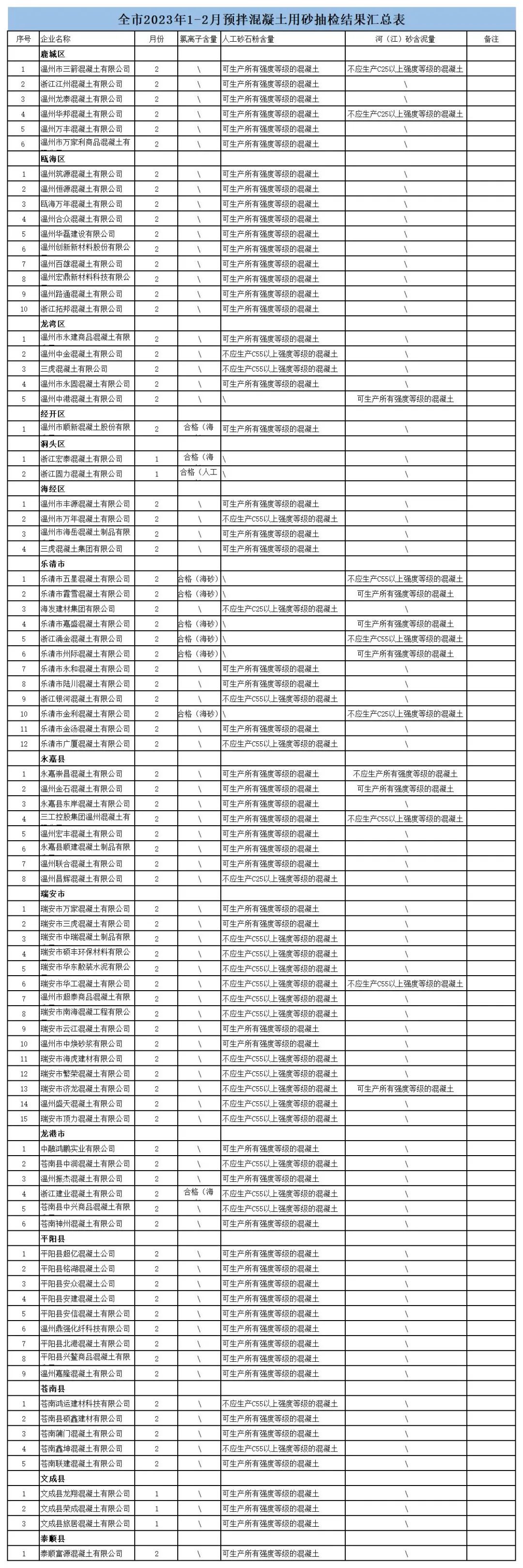 近日,據(jù)了解,浙江溫州為進一步管理預拌混凝土用砂質(zhì)量,嚴查砂石質(zhì)量。2023年1-2月,浙江溫州各地住建部門對轄區(qū)內(nèi)預拌混凝士企業(yè)用砂進行了檢查,共87家在生產(chǎn)的預拌混凝士企業(yè),抽檢了各品種砂100組。