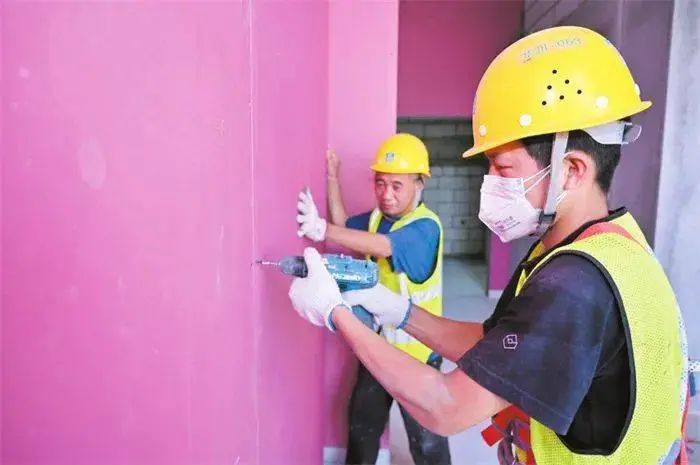 3月22日,海南省婦幼保健院異地新建工地上,工人正忙著室內(nèi)裝飾裝修,除了衛(wèi)生間等以外,取消混凝土砌墻并采用輕質(zhì)隔墻板工藝。在住院樓1號(hào)樓房間內(nèi),成塊的石膏板和阻燃板拼裝在龍骨支撐架上,內(nèi)置有保溫隔音棉,墻面宛如一個(gè)拼圖。“材料基本沒(méi)有浪費(fèi)的,切割的余料可以循環(huán)利用,裝修拐角等邊角。”在安裝工人周發(fā)財(cái)?shù)挠∠罄铮酝覂?nèi)裝修施工產(chǎn)生的建筑垃圾較多,現(xiàn)在這些問(wèn)題迎刃而解。