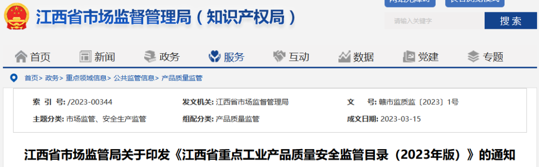 江西省市場監(jiān)管局關于印發(fā)《江西省重點工業(yè)產品質量安全監(jiān)管目錄(2023年版)》的通知各設區(qū)市、贛江新區(qū)市場監(jiān)管局,各省直管縣(市)市場監(jiān)管局: