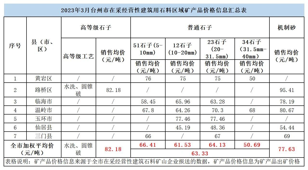 2023年3月份,浙江臺州高等石子均價82.18元/噸、普通石子均價63.33元/噸、機制砂均價77.63元/噸;相比2月高等石子均價78.29元/噸、普通石子均價62.79元/噸、機制砂均價92.03元/噸。其中,機制砂下跌幅度最大約15元/噸。