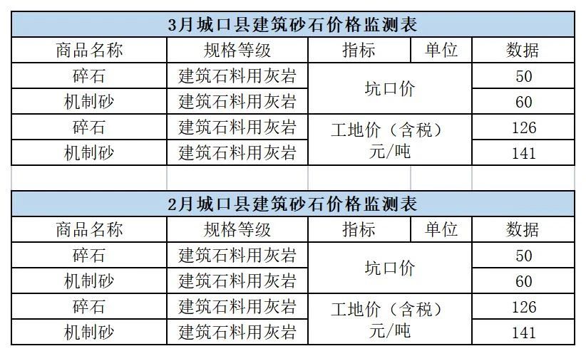 2023年3月份,重慶城口碎石坑口價50元/噸、工地價含稅126元/噸;機制砂坑口價60元/噸、工地價(含稅)141元/噸。與2月相比持平。