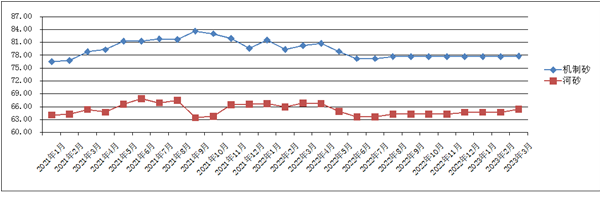 2023年3月份,甘肅省砂石平均出廠價格機制砂(細砂)每噸77.78元,河砂(細砂)每噸65.45元,環(huán)比分別上漲0.12%、1.16%;同比,機制砂、河砂分別下降3.04%、2.05%。
